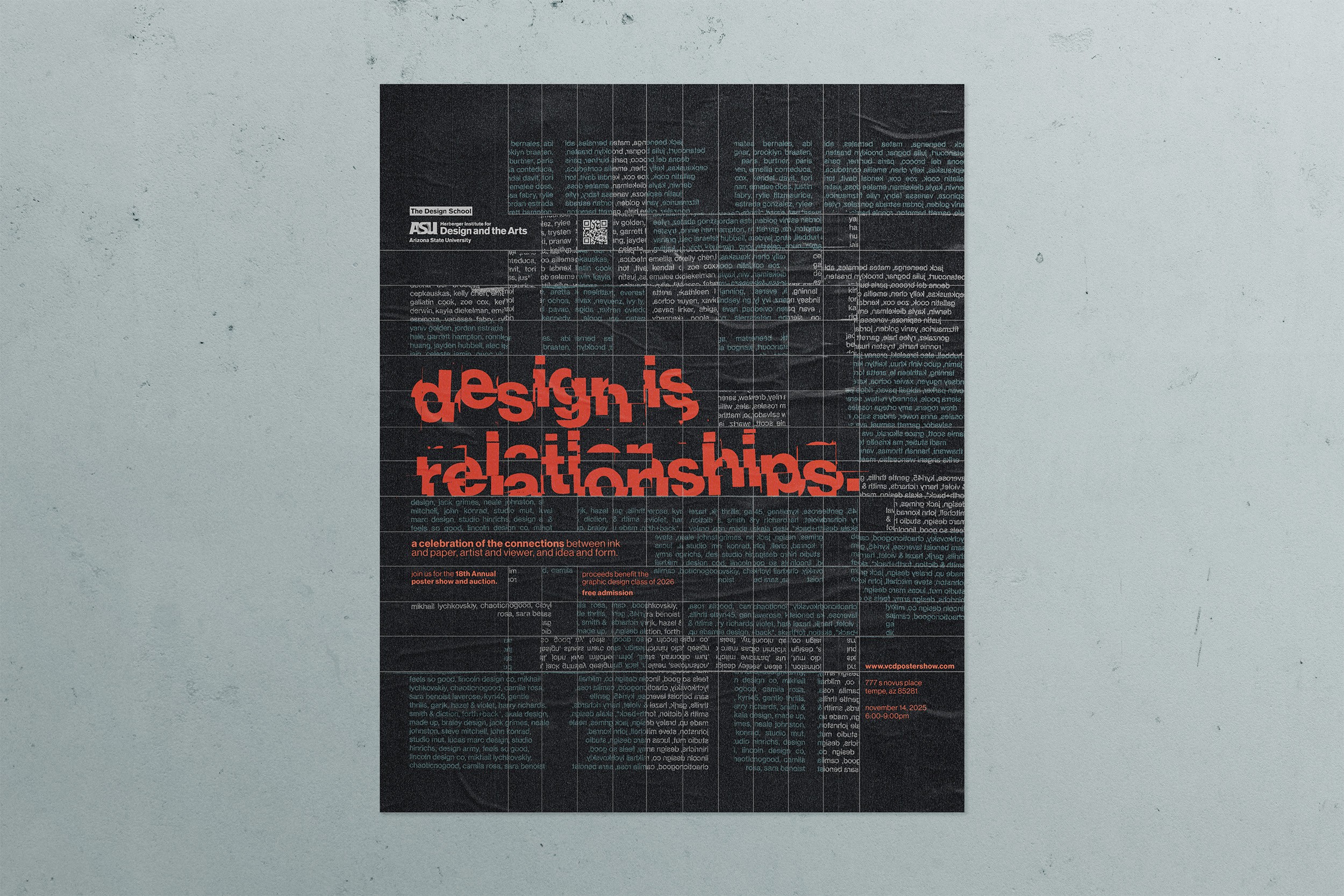 We were tasked with designing a poster for ASU’s annual VCD Poster Show, and my solution leaned on a handmade process—cut-paper elements rearranged into a graphic composition that feels constructed rather than purely digital. The poster centers a Paul Rand quote, while the background text is built from the names of my classmates, turning the piece into both an announcement and a subtle portrait of our studio community.